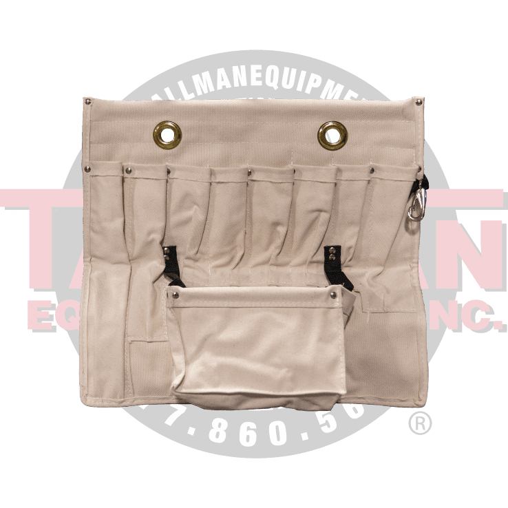 Canvas; Pockets: Seven (7), Vary in size for Hand Tools, One (1) Auger Bit, One (1) 8″ x 4″ with Plastic Stiffener for Easy Access with support hangars and One (1) Quick Release Snap