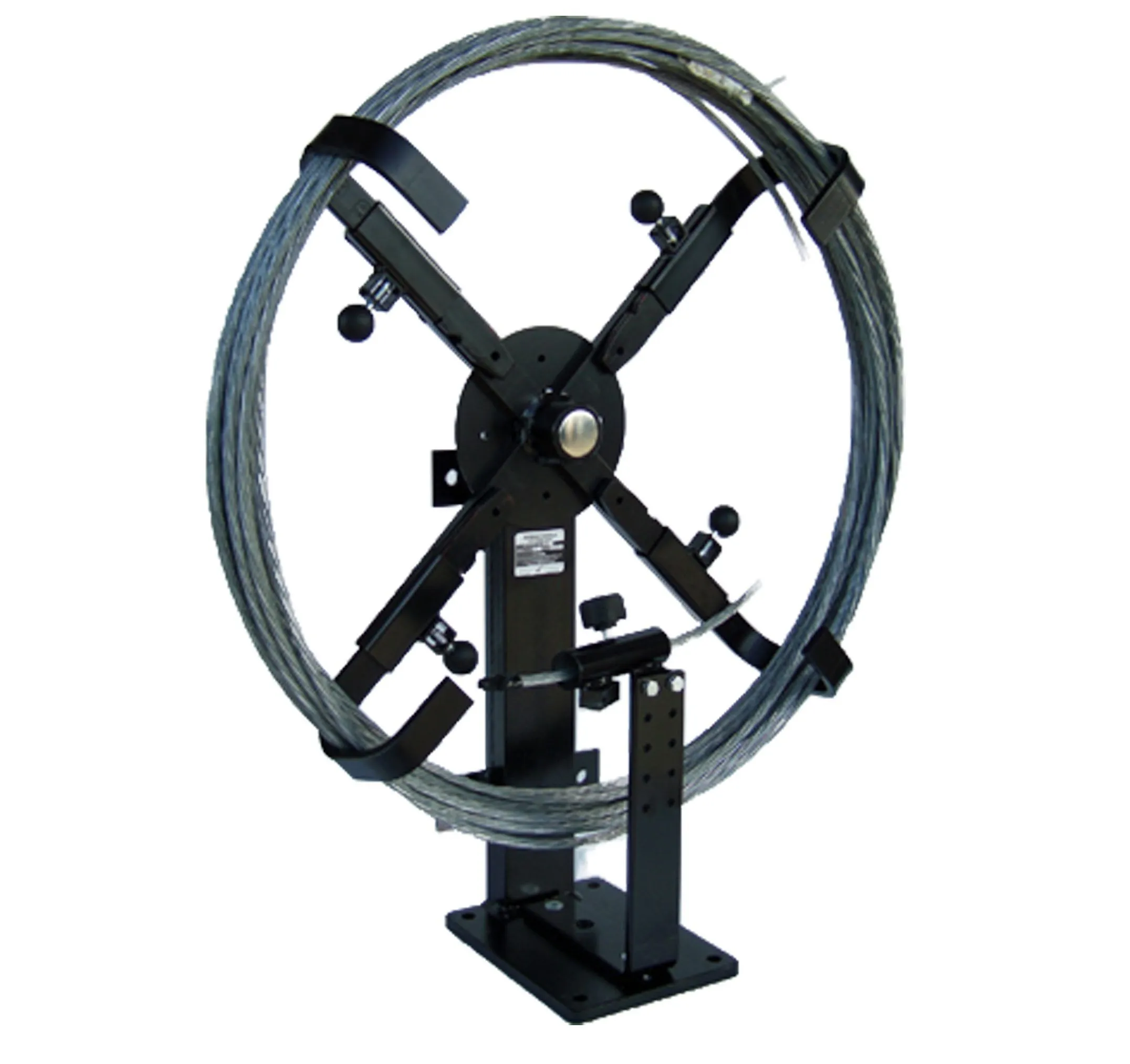 RoboReel™ Guy Wire Dispenser Reel – designed for linemen to provide an easy and safe means to unwind and rewind cumbersome guy wire and cable. Extremely rugged, all-weather heavy-duty reels. Made of steel and coated with black industrial PPG Durethane® to ensure long life, RoboReels™ have four adjustable arms that allow an easy and secure means of loading, unwinding, and rewinding various coils with different diameters. Coils can be simply rolled into the stand and clamped into place with the adjustable arms. Wire is easily pulled or rewound through “smooth” center guides. Universal Mounting Feature – RoboReel™ can be installed on a floor or wall with a universal guy/cable exit.