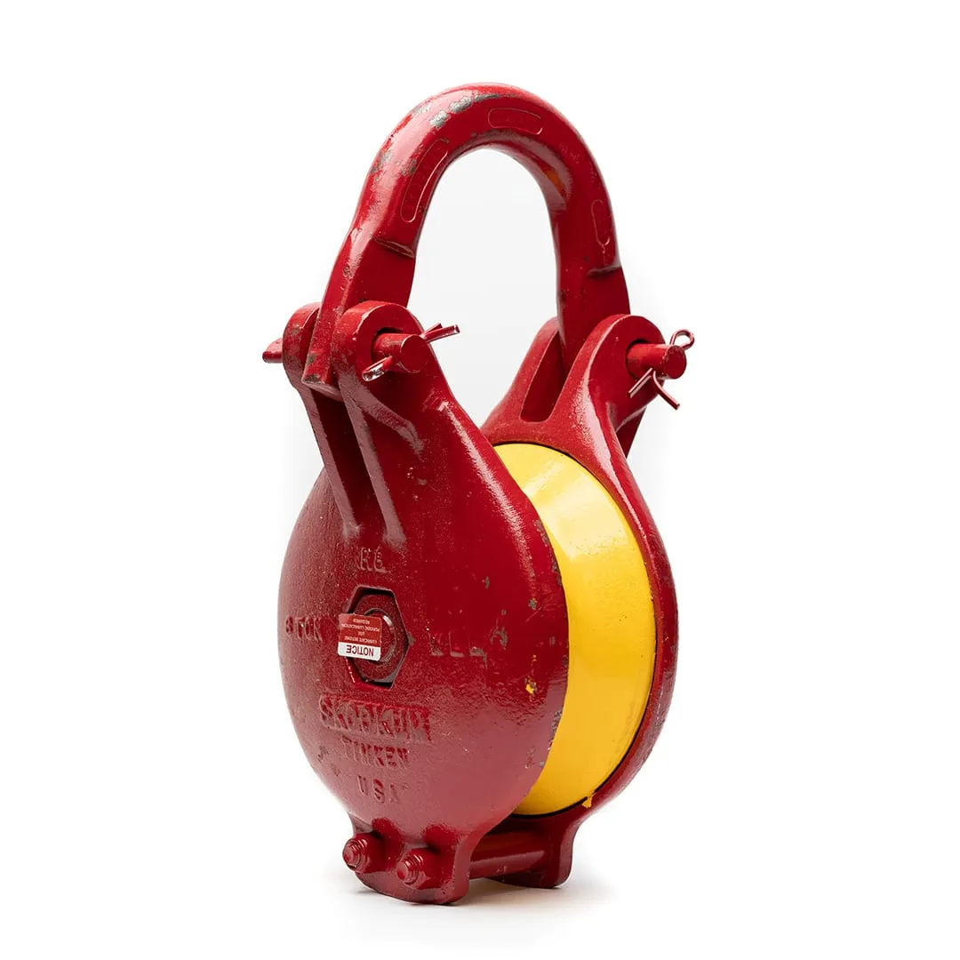 Only the Skookum R Series Full-Sided Rigging Blocks offer both wide throat and Utili-Sheave. A wide throat makes it much easier to pull a variety of line, connecting links, or oversized line conditions. Wide manganese steel Utili-Sheaves work harder and last longer. These blocks are the choice of operators for heavy-duty work. Built with no superfluous weight but a big reserve of strength and ruggedness. Equipped with long life Timken Bearings. Yokes and yoke pins are forged and heat-treated alloy steel. The block sides are the frame of the block–the unique shape fenders the rim of the sheave providing maximum protection from line jamming while minimizing weight which is both critical to performance.